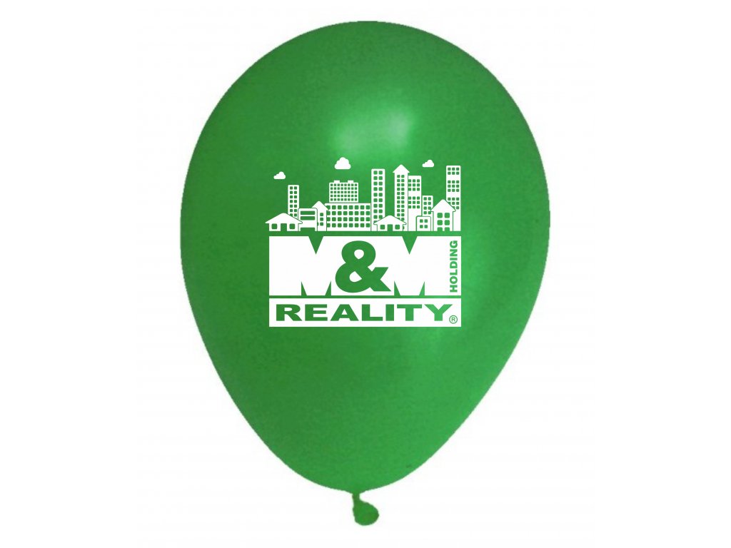 Klasické nafukovací balonky v zeleném provedení s bílým logem M&M a domečky. Balonky mají po nafouknutí průměr 27 cm.