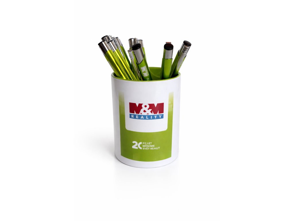 Bílý keramický stojan se zeleným vnitřkem na psací potřeby s logem MMR. Výška 9,5 cm.