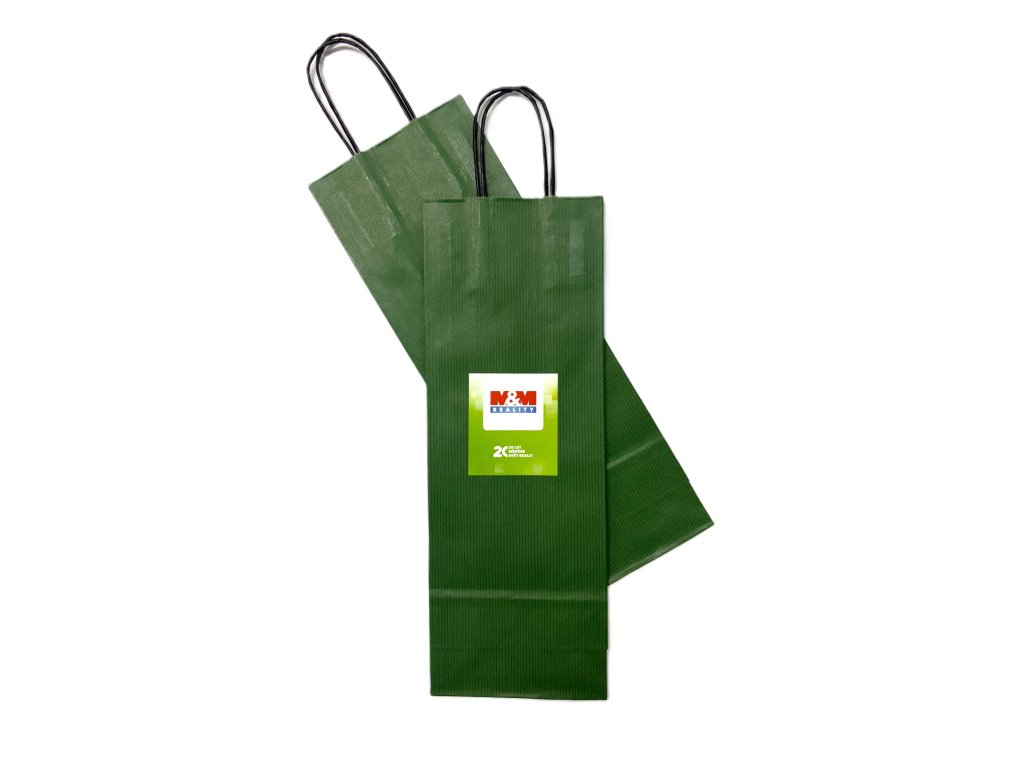 Papírová taška na víno nebo jiný dárek či předmět. Taška je tmavě zelená s barevným potiskem.