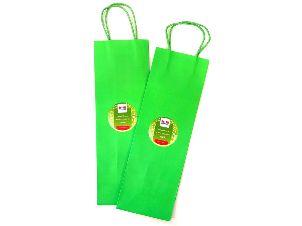 Vánoční papírová taška na víno nebo jiný dárek či předmět. Taška je zelená se samolepkou.